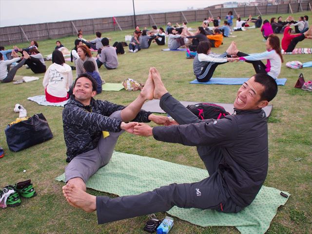 みんなでペアワーク(左:三宅)。こんな楽しいヨガもあります。