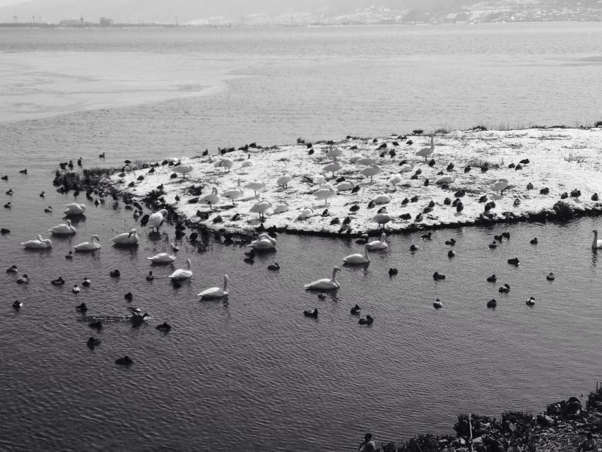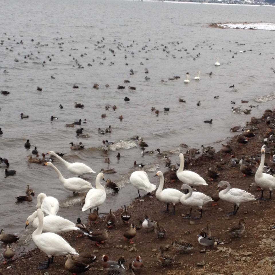 今日の諏訪地方は3月上旬の暖かさで、諏訪湖はワカサギ釣りや白鳥見学の方で賑わってました。